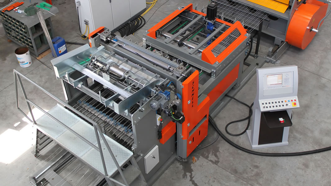 Machine pour la production de treillis soudés à l’électricité alimentée par des barres et des bobines. Cette machine produit des treillis avec des fils transversaux pré-redressés et coupés à mesure et des fils longitudinaux directement fournis par bobines. Le largueur maximale du treillis est de 1250 mm, la longueur n’a pas de limites.